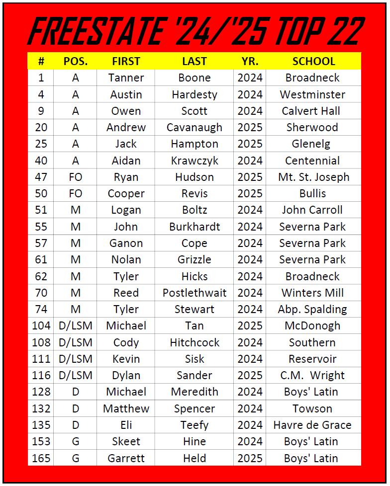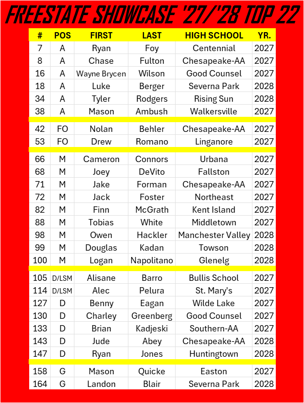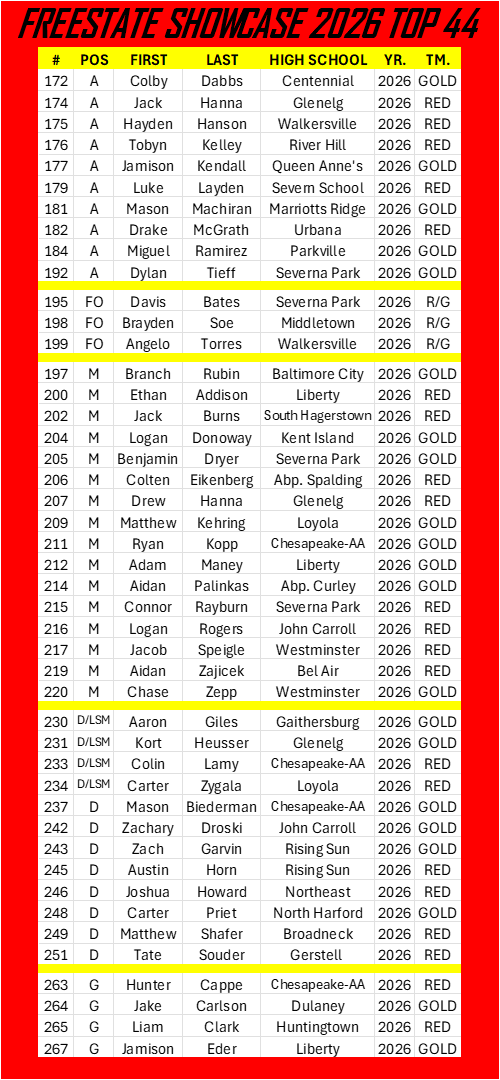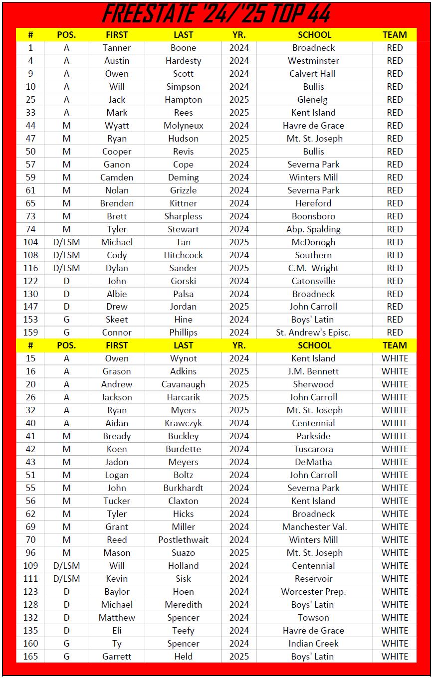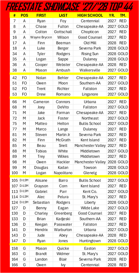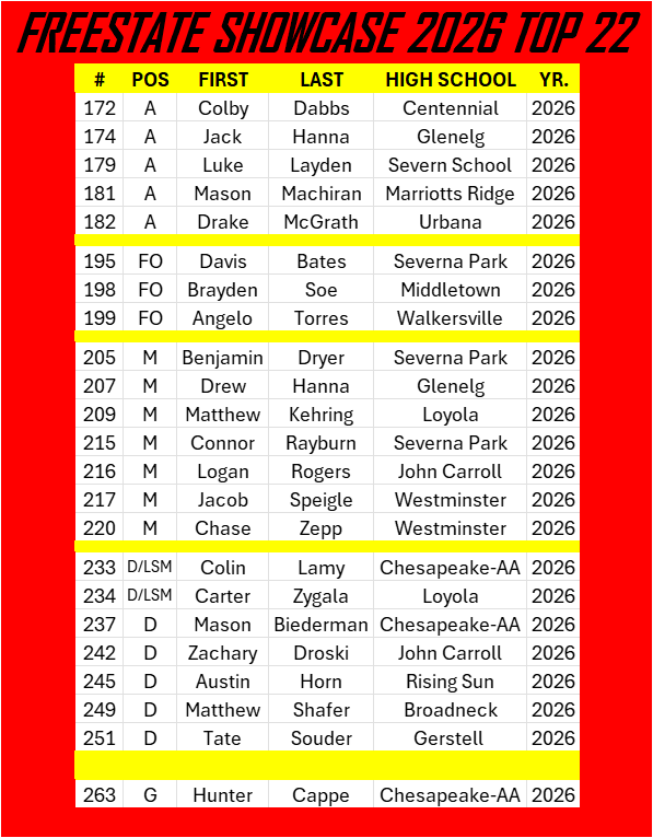 The M.S.L.C.A. would like to thank everyone who participated in the 2025 FREESTATE SHOWCASE on June 1st, 2025. The MSLCA would congratulate the all of the players that were selected to the FREESTATE SHOWCASE TOP 44 Games.